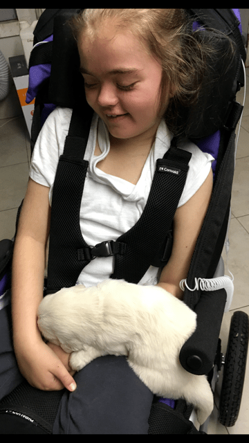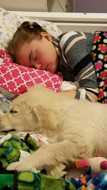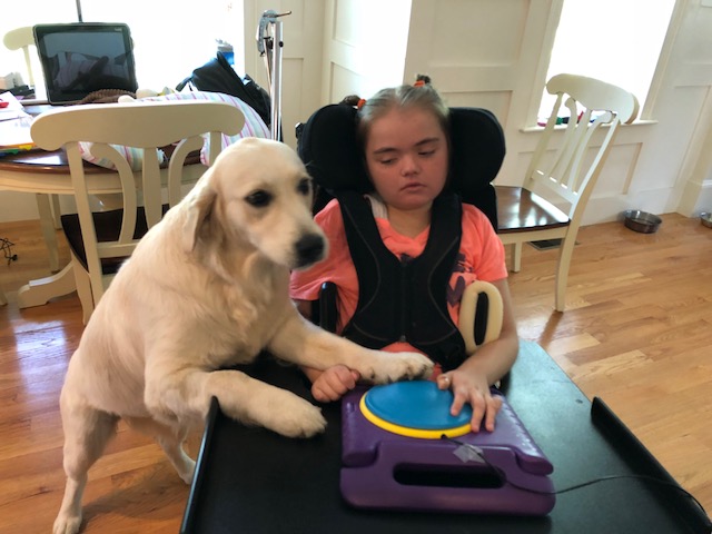 Below, please find photos of Caitlin McCarthy with her dog Josie. The Will Golden Memorial Fund in conjunction with the Kate Phalon McCarthy Memorial Fund helped to secure a dog for Caitlin McCarthy and her family through GOFI. Caitlin was diagnosed at the age of one with Mitochondrial disease and with Rett Syndrome when she was five years old. Josie is a beautiful one year old Golden who has been working this past year to attain her service status. Her devotion, love and hard work has endeared her to Caitlin and the entire family.